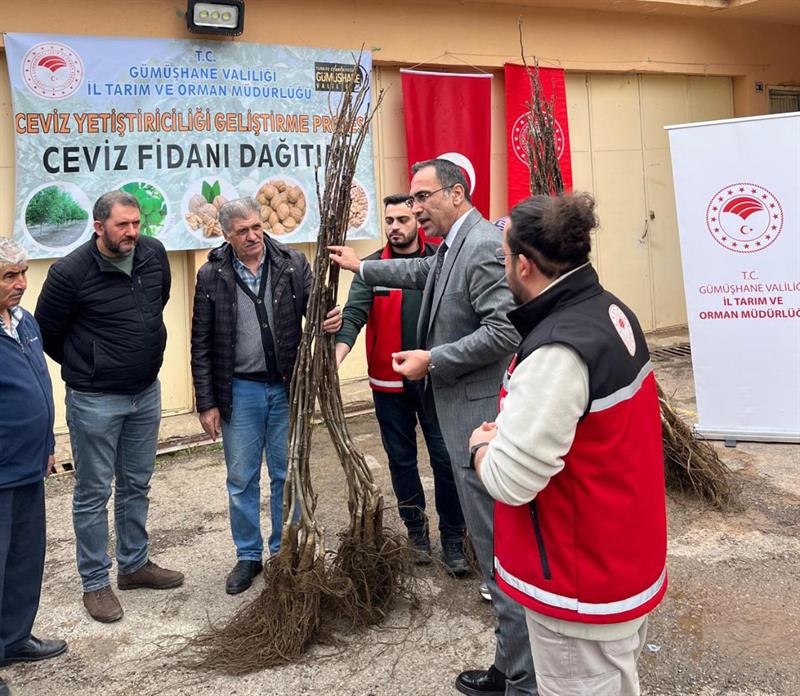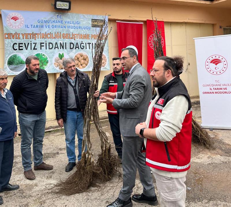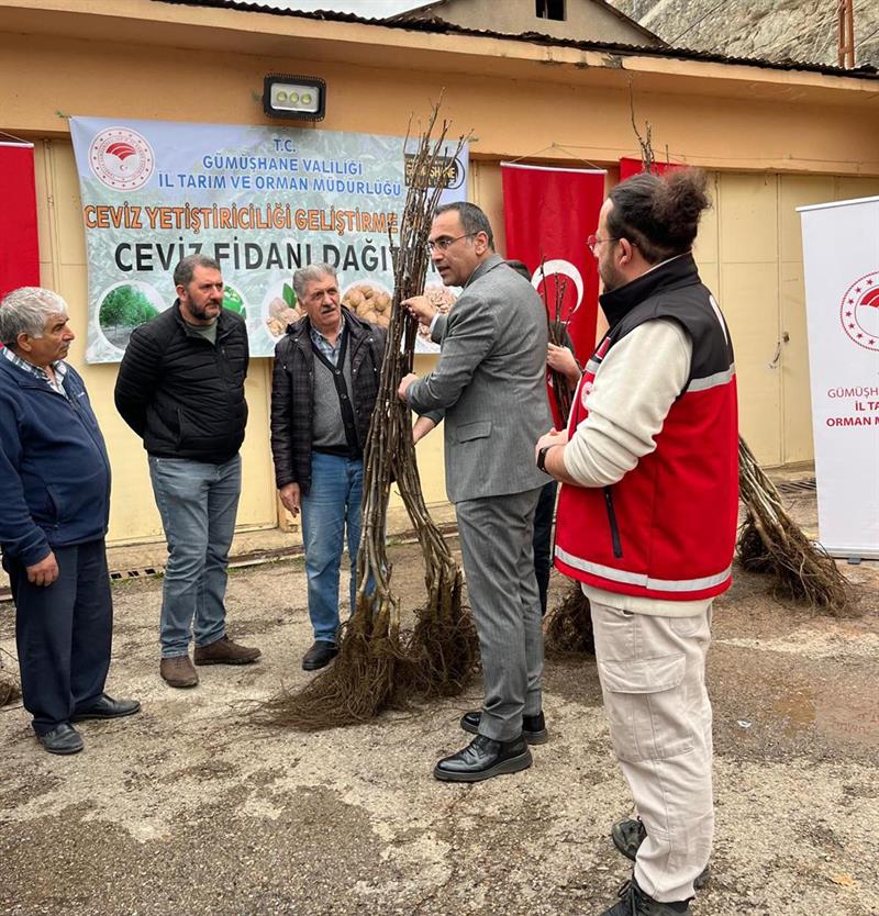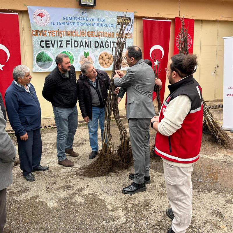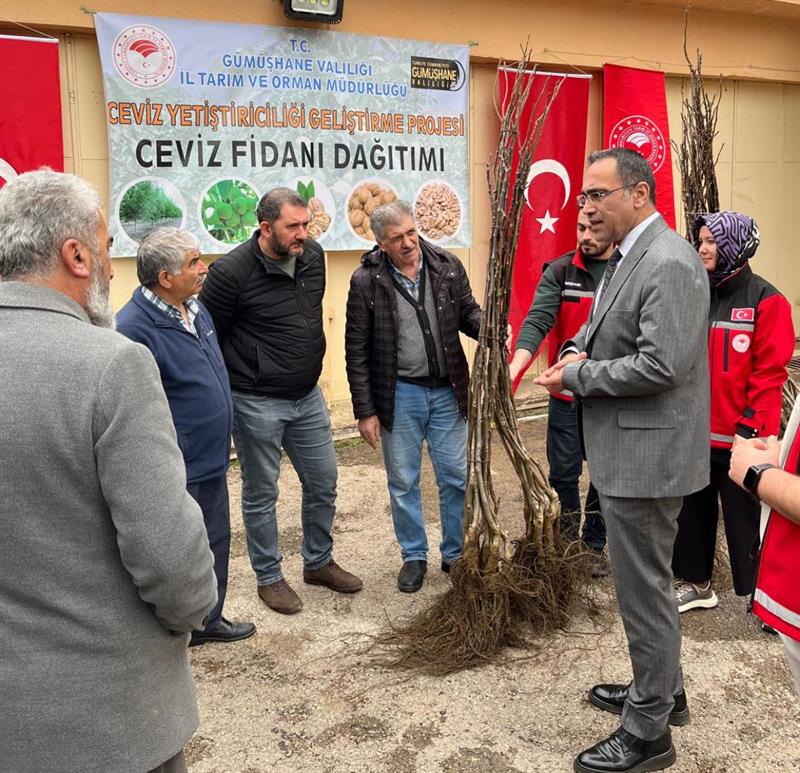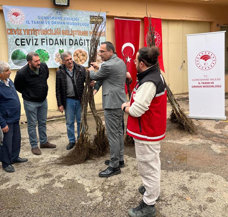 Gümüşhane'de tarımsal üretimin artırılması ve ceviz yetiştiriciliğinin geliştirilmesi amacıyla hazırlanan “Ceviz Yetiştiriciliğinin Geliştirilmesi Projesi" kapsamında üreticilere yüzde 50 hibeli ceviz fidanı dağıtımı gerçekleştirildi.